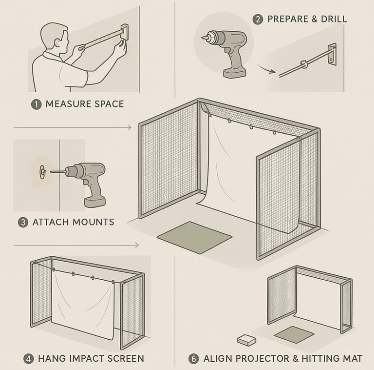 Plot out your room dimensions, hitting area, and screen placement. Allow for at least 10–15 feet distance from the projector to the screen for most home simulators. If you’re comparing full setups, something like Impact Screens vs Impact Screens With Enclosure can help you decide how much space and structure you actually need. Confirm wall or ceiling stud locations with a stud finder.Prepare Mounting Hardware